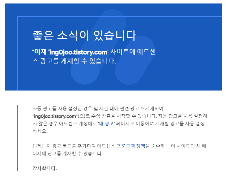 그리고 다시 애드센스 심사를 신청했고 기다렸더니 통과가 되었습니다.