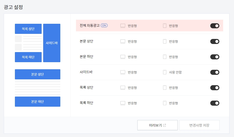 그래서 살펴보니 역시나 켜져있지 않아서 자동 광고 버튼을 활성화시켰습니다.
