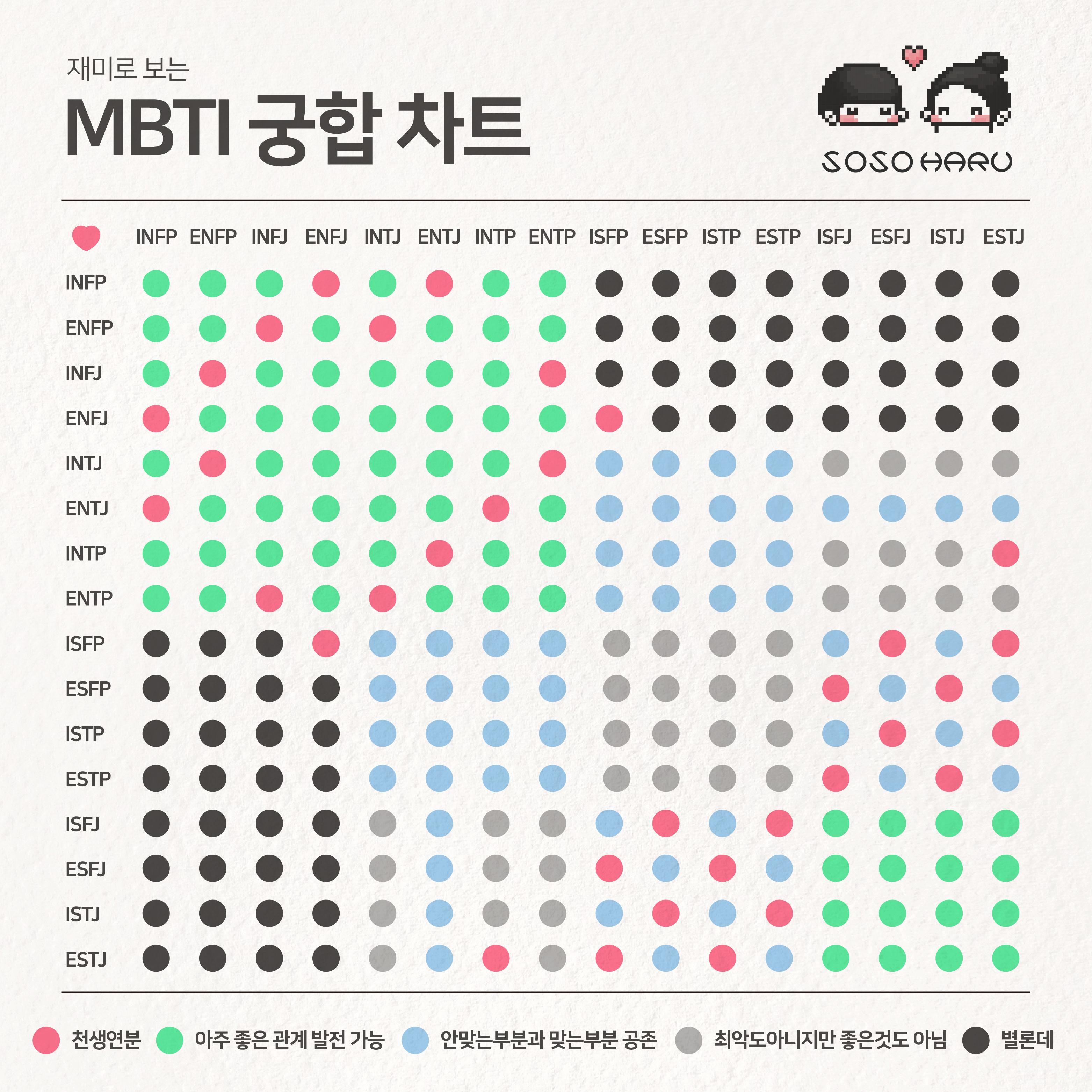 물론 사람마다 다른 성격이고 성향도 달라서 모든 사람에게 적용할 수는 없지만 재미로 MBTI 궁합을 보는 것도 좋을 듯합니다.